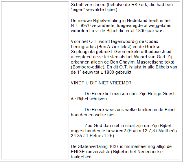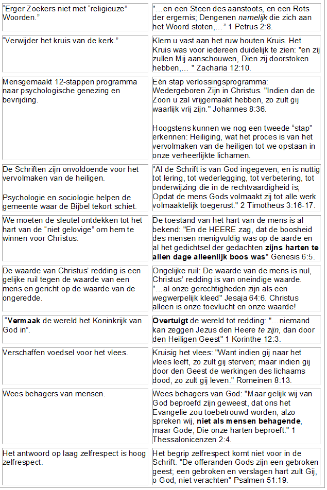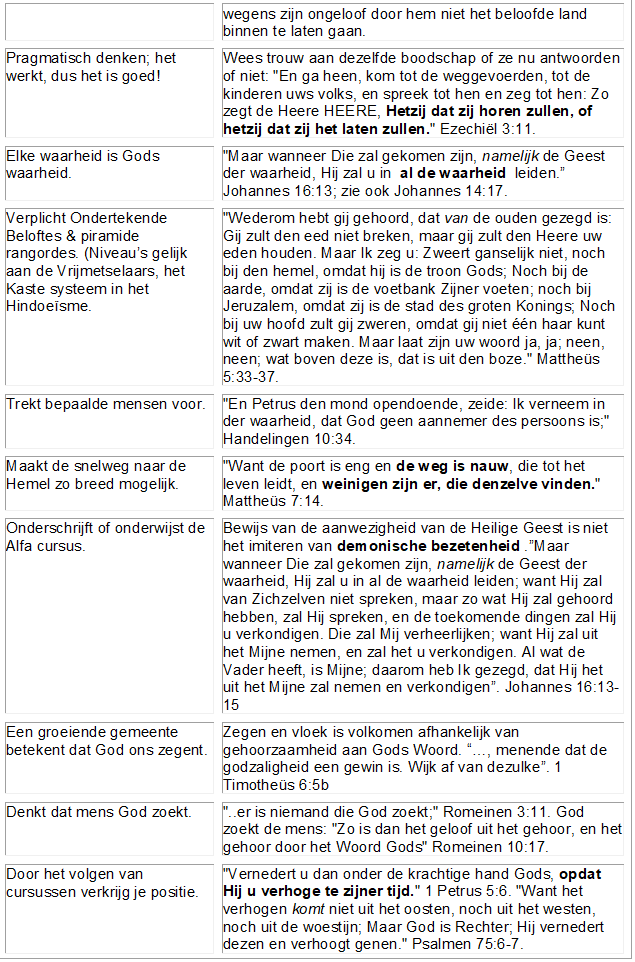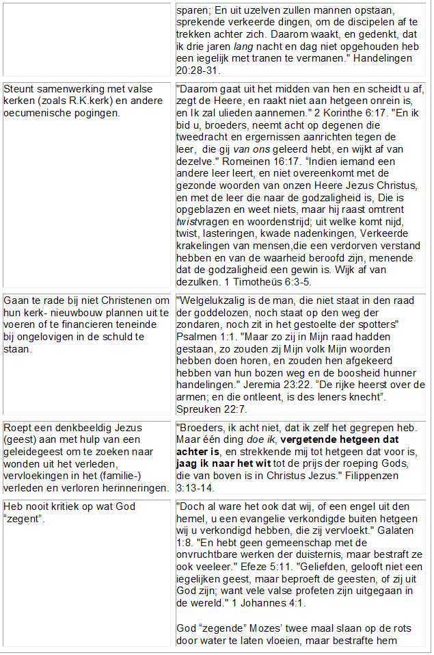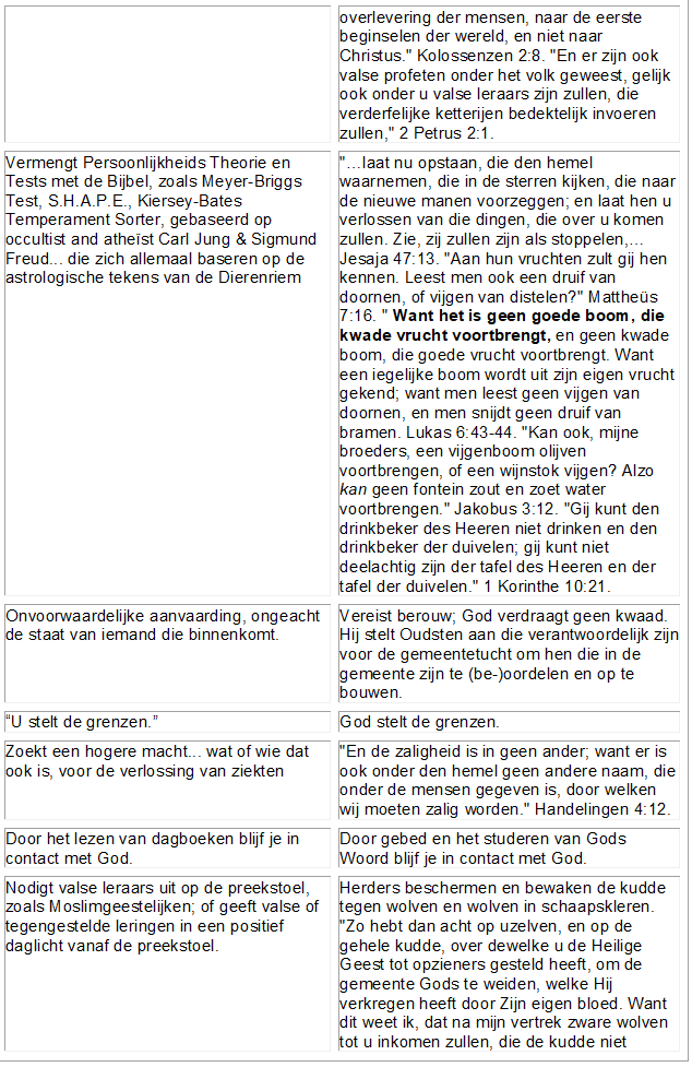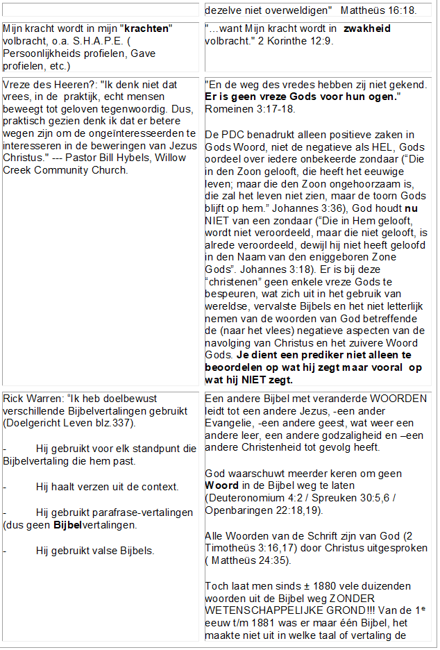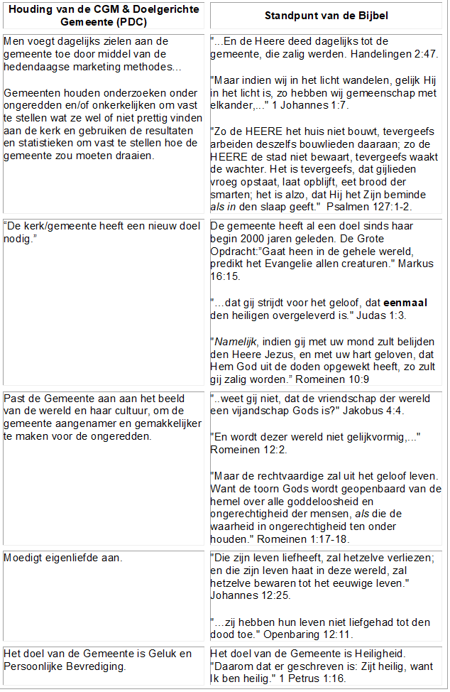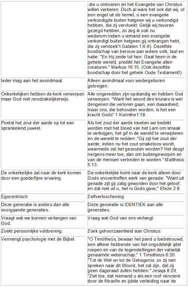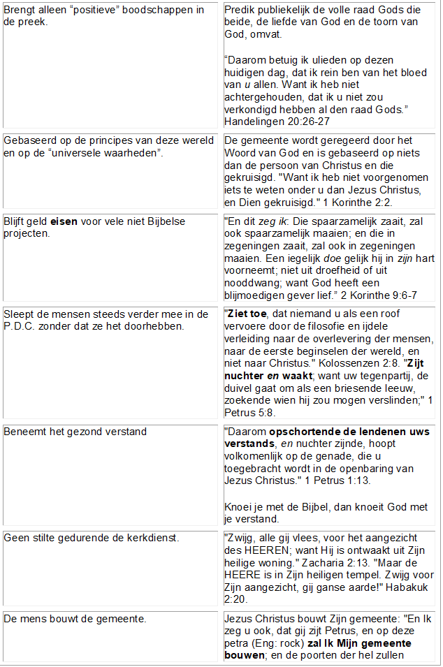 LET OP: Niet elke PDC/CGM gemeente staat voor elk standpunt in de tabel, maar de tabel is een algemene leidraad, bedoeld om de heiligen toe te rusten en te waarschuwen.Overigens zijn de meeste kerken in Amerika die P.D.C. volgen al ten prooi gevallen aan deze punten. P.D.C. werkt als een epidemie door de kerken. Het is voor Nederland slechts een kwestie van tijd ( Matt.13:33/ 2 Tim. 4:3,4).